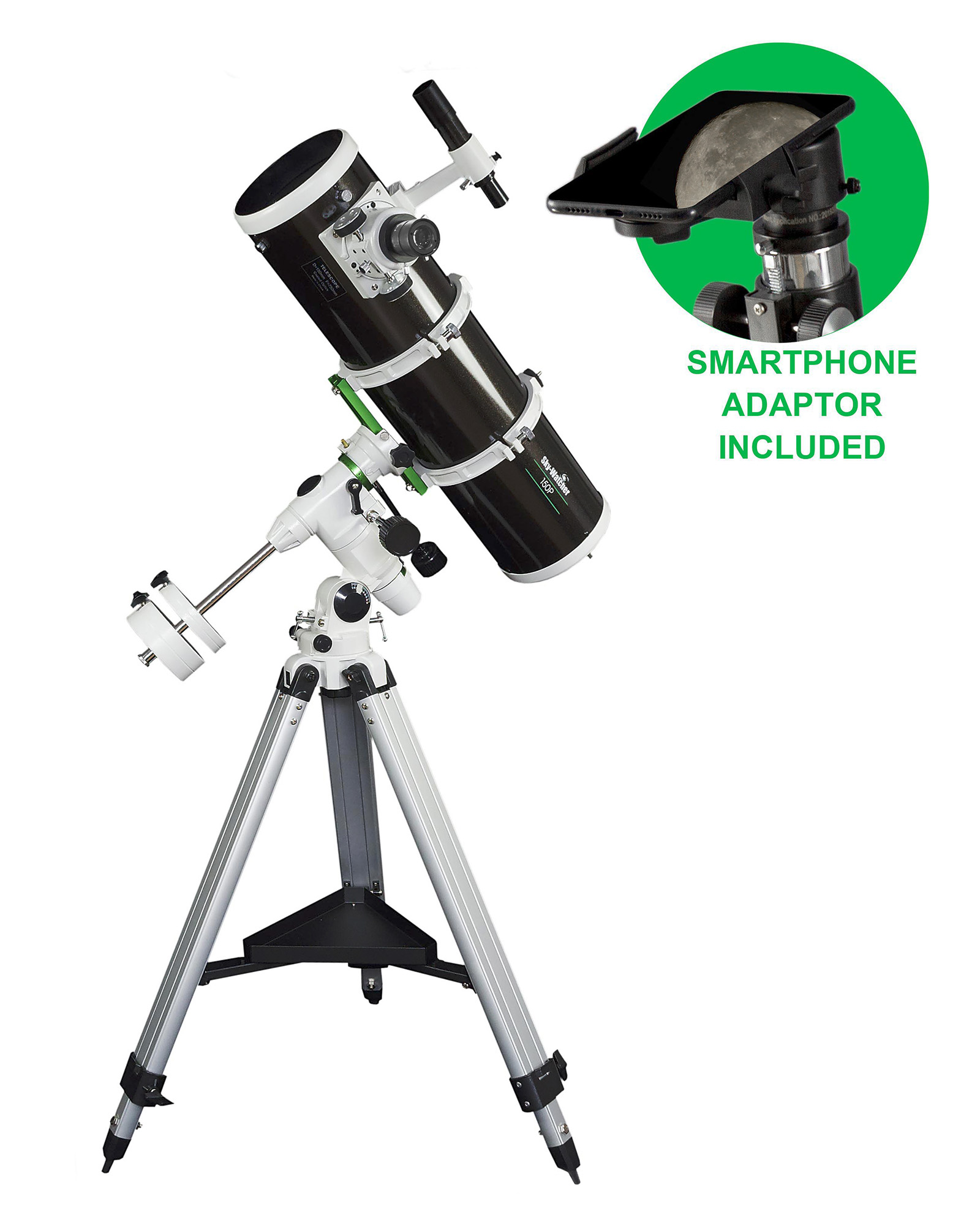 The Explorer 150PL is a 150mm f/8 Newtonian on an EQ3-2 equatorial mount — Sky-Watcher's traditional mid-range telescope in a longer focal length configuration.